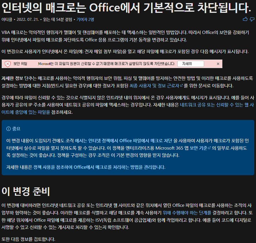 2022-07-27부터 인터넷에서 받은 VBA 매크로 파일의 실행이 차단된다.