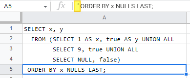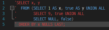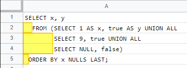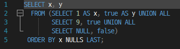 FROM (SELECT 1 AS x, true AS y UNION ALL
