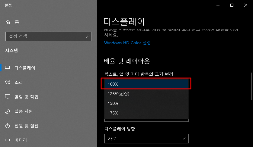 1. Windows 바탕 화면 마우스 오른쪽 버튼 클릭 > 디스플레이 설정 > 배율 및 레이아웃 > 텍스트, 앱 및 기타 항목의 크기 변경 > 100% 선택