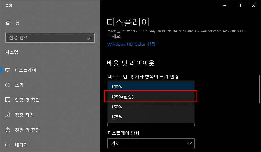 1. Windows 바탕 화면 마우스 오른쪽 버튼 클릭 > 디스플레이 설정 > 배율 및 레이아웃 > 텍스트, 앱 및 기타 항목의 크기 변경 > 125% 선택