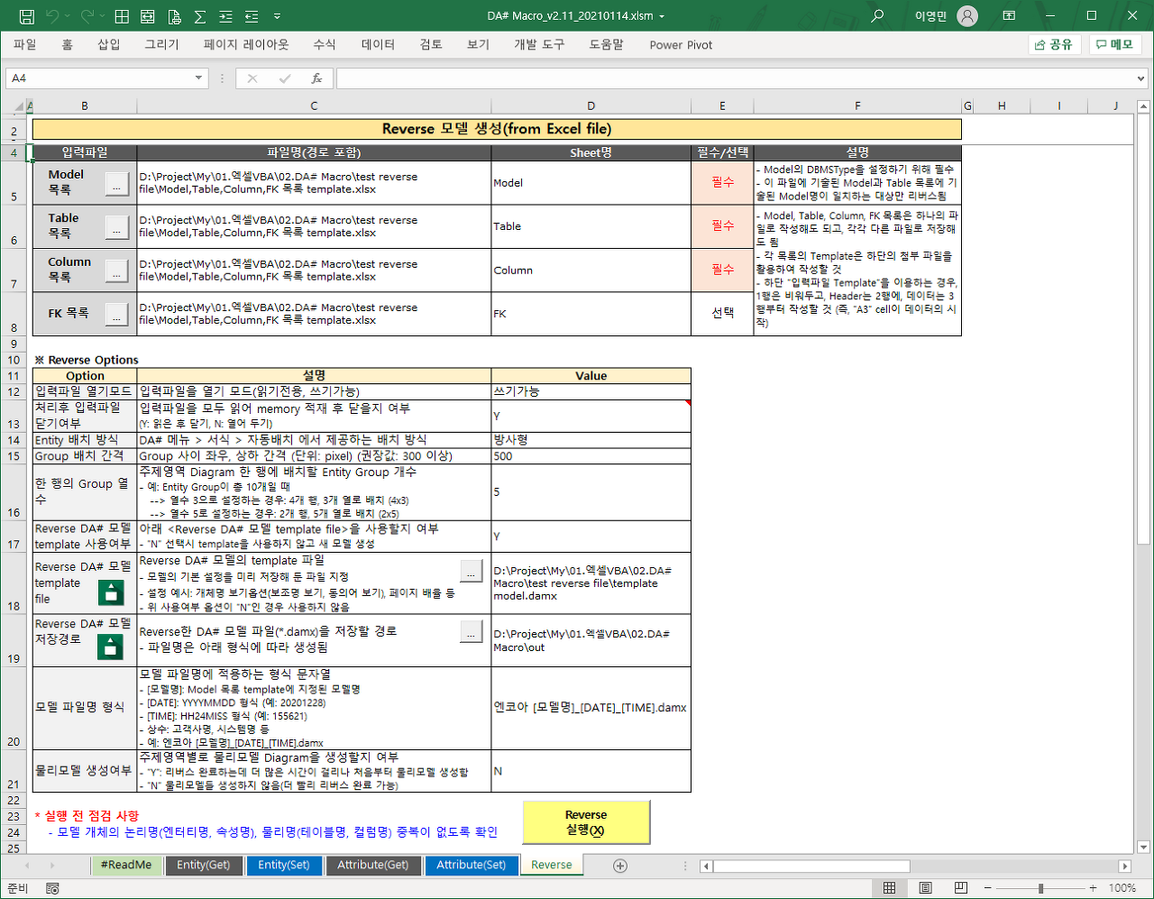 [Add] Reverse 기능 추가: 엑셀 파일로 작성된 테이블 정의서, 컬럼 정의서로부터 DA# 모델 생성 - 여러 모델을 한번에 Reverse (각 모델별 DBMSType, 정의 설정 가능) - 테이블의 주제영역을 설정하여 주제영역별로 나누어서 Reverse - 엔터티 그룹 지정으로 한 주제영역내에서 그룹별로 한 위치에 묶어서 배치 - 엔터티 그룹명 텍스트 박스 추가는 나중에...(현재 텍스트 박스 생성 API가 제공되지 않음) - UDP 설정은 이 버전에서는 포함하지 않음 (향후 필요시 포함) [Fix] 데이터 첫행의 Named Range를 Header로 변경(첫행 삭제하는 경우 오류 방지) |