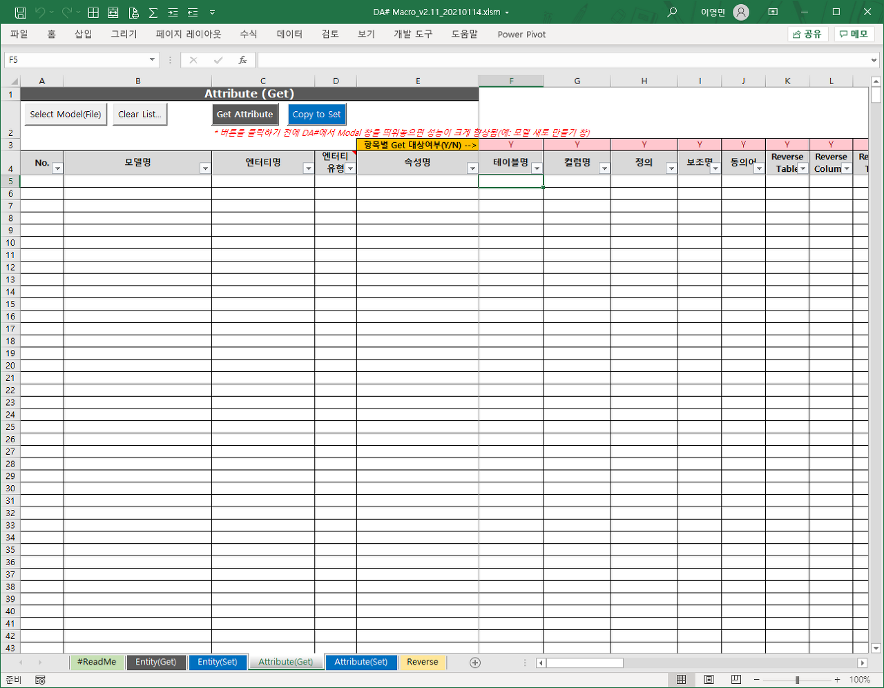 - Set Entity/Set Attribute 버튼: 엑셀 목록의 정보를 선택한 모델에 반영. 선택한 모델들을 열고, 반영하고, 저장하고, 닫고, 다음 모델을 순차적으로 반복함(엑셀 목록의 값이 비어 있는 경우 DA# 모델의 해당 property값을 변경하지 않음)