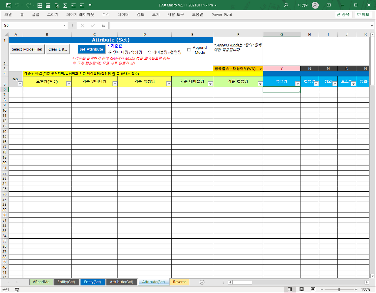 - Append Mode: DA# 모델의 정보항목 현재 값에 엑셀 값을 Append 할지 여부