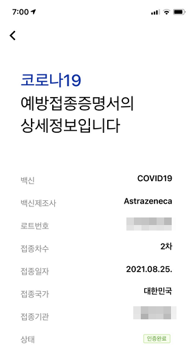 1차는 6월 9일(수), 2차는 8월 25일(수) 11주 간격이고 1,2차 모두 아스트라제네카로 접종했다.