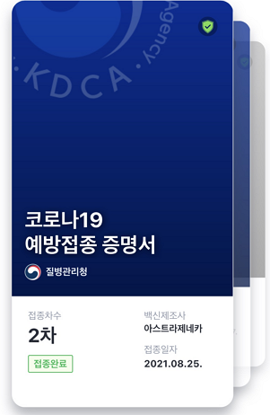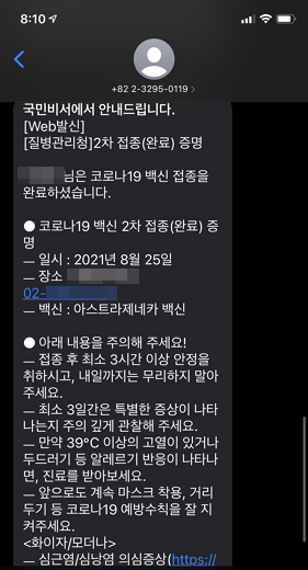 접종 후 30분 정도 후에 "2차 접종(완료) 증명" 문자를 받았고, 질병관리청 "코로나19 전자예방접종증명 COOV" 앱에서도 증명서를 확인할 수 있다.