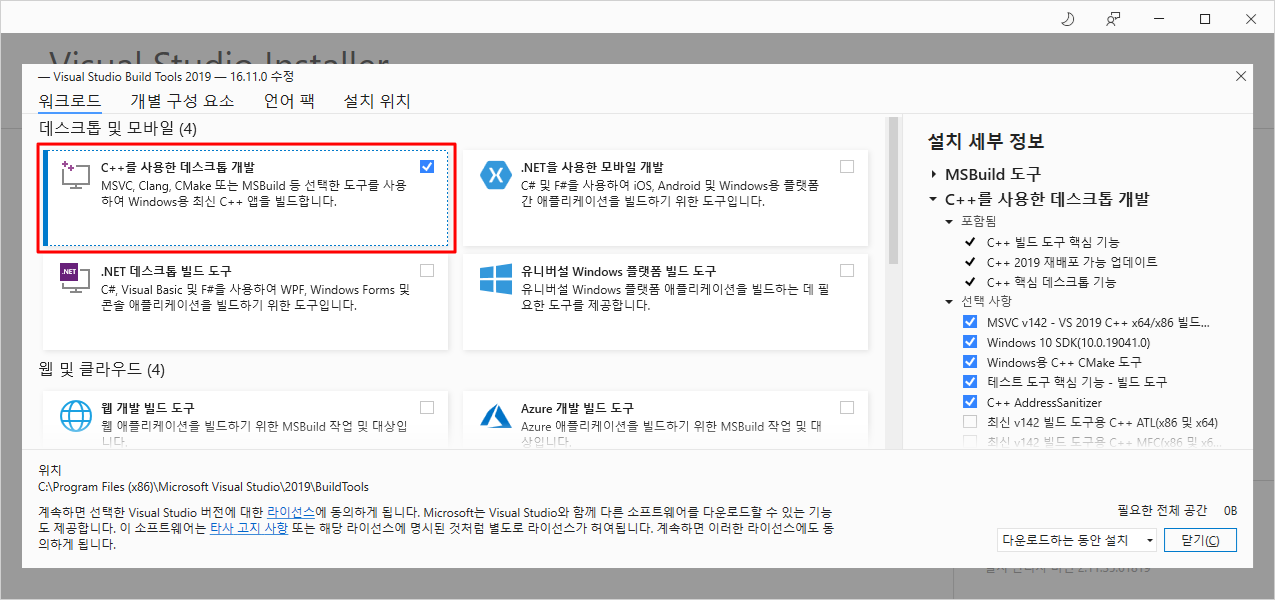 설치시 “C++를 사용한 데스크톱 개발”을 선택하고 설치한다. (아래 화면은 설치 이후에 캡쳐한 화면으로 설치시 화면과 약간 다르다)