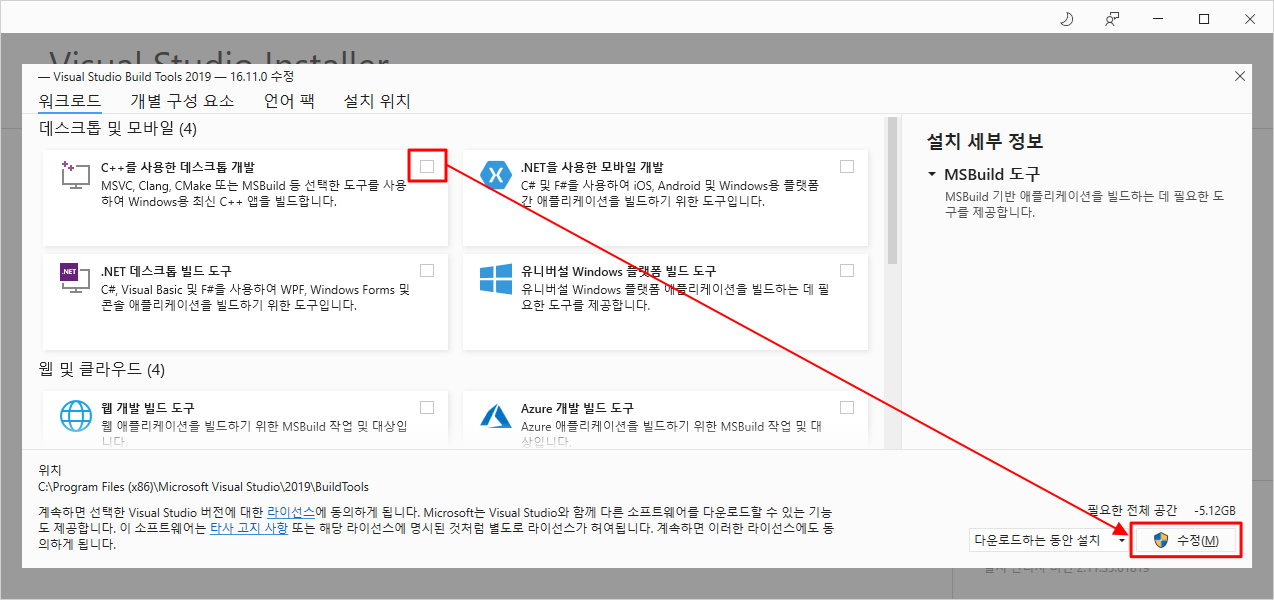 시작 메뉴에서 ‘Visual Studio Installer’를 실행하고 “C++를 사용한 데스크톱 개발” 선택 해제, 우측 하단의 “수정”버튼을 클릭하여 제거한다.