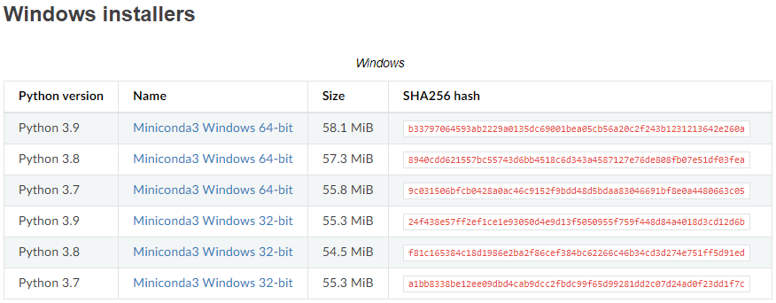 https://conda.io/en/latest/miniconda.html#windows-installers 에서 Python version을 선택하여 다운로드 한다. 단어 추출 도구는 Python 3.8에서 개발하였고, 3.9에서도 잘 동작한다. 여기서는 3.9를 다운로드하고 설치하겠다.