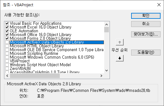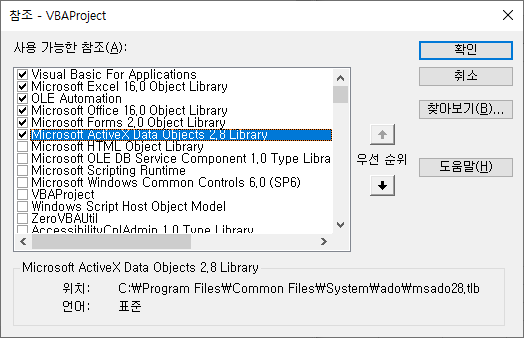 - Microsoft ActiveX Data Objects 2.8 Library 참조 추가