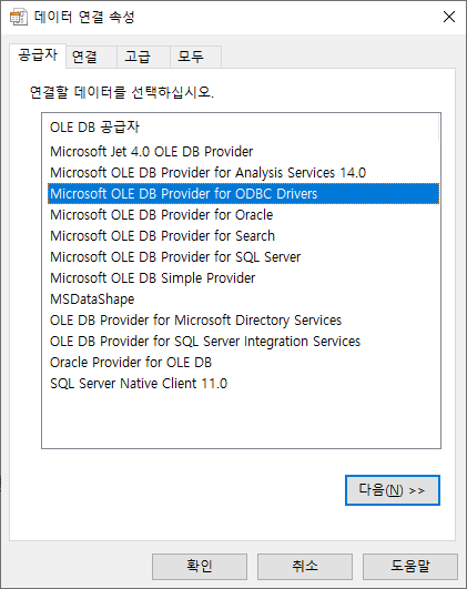 5. test.udl 파일을 "UDL 32bit" 바로 가기 아이콘에 드래그 & 드랍한다. 이 때 보여지는 화면이 32bit Provider(공급자) 목록이다.