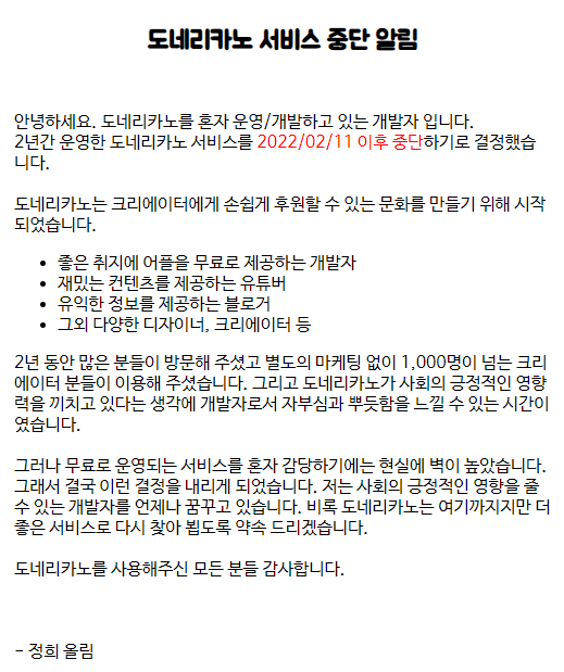 그러나 무료로 운영되는 서비스를 혼자 감당하기에는 현실에 벽이 높았습니다. 그래서 결국 이런 결정을 내리게 되었습니다. 저는 사회의 긍정적인 영향을 줄 수 있는 개발자를 언제나 꿈꾸고 있습니다. 비록 도네리카노는 여기까지지만 더 좋은 서비스로 다시 찾아 뵙도록 약속 드리겠습니다.