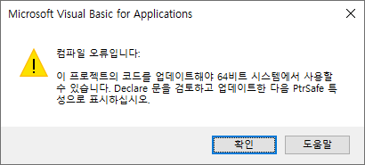 이 프로젝트의 코드를 업데이트해야 64비트 시스템에서 사용할 수 있습니다. Declare 문을 검토하고 업데이트한 다음 PtrSafe 특성으로 표시하십시오.